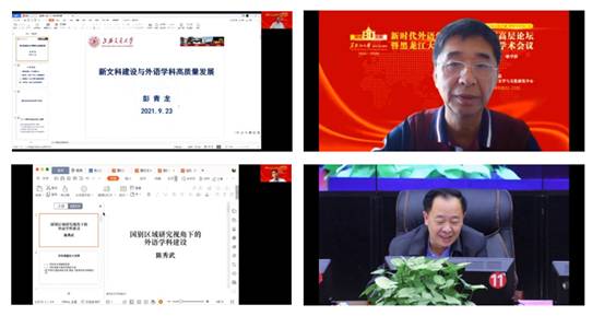 彭青龙演讲主题为《高质量发展、新文科与外语学科和专业内涵建设》,认为外语学科应主动对接国家对高质量发展这一需求,利用该契机在高层次国家化人才培养、话语体系构建和国际传播等方面展现新作为、做出新贡献,强调面向未来的科研与人才培养,外语学科的师生应该具备过硬的政治素养、厚实的学科素养及扎根中国大地的文化素养和与时俱进的科技素养。