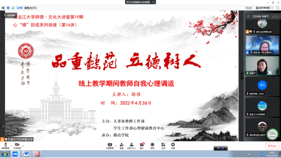 为提升教师在疫情期间的自我心理调适能力,更好地开展线上教学和管理工作,进一步促进公司党建、工会与教学等工作的深入融合。4月26日下午14:00,由人事处教师工作部、员工工作部心理健康教育中心主办,yl1111永利集团承办的“品重懿范 立德树人”师德·文化大讲堂第19期暨心“晴”防疫系列讲座第16讲在线上举行。本次讲座邀请了哈尔滨市第一专科医院心理卫生中心主任徐佳医生,讲座主题为“线上教学期间教师自我心理调适”。讲座由人事处处长张晶平和员工工作部副部长、心理健康教育中心主任李巾英共同主持。yl1111永利集团教师全员参加,学校各教学科研单位一线教师参加了本次讲座。
