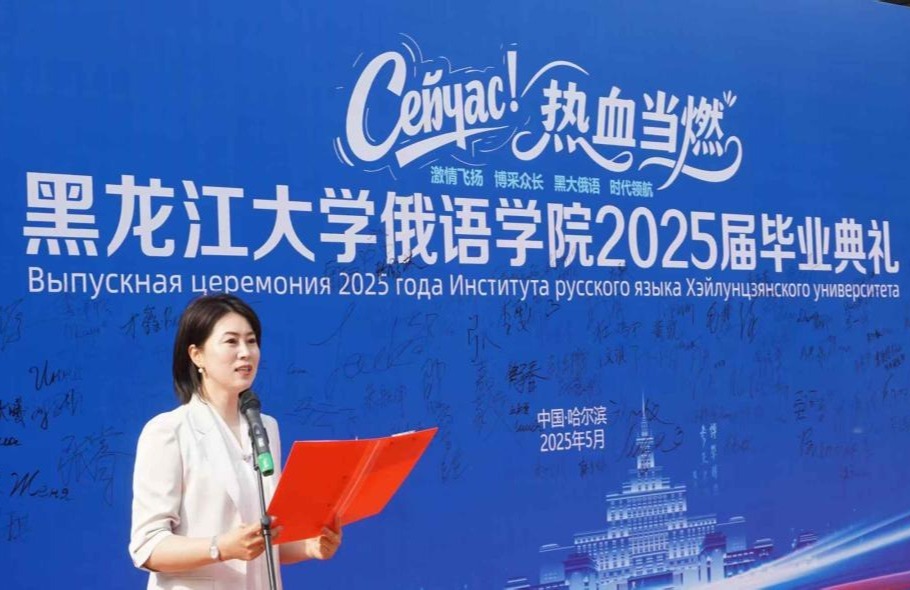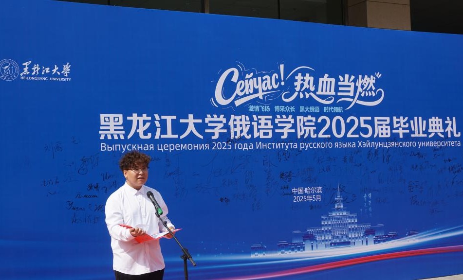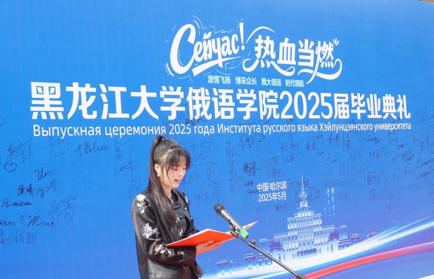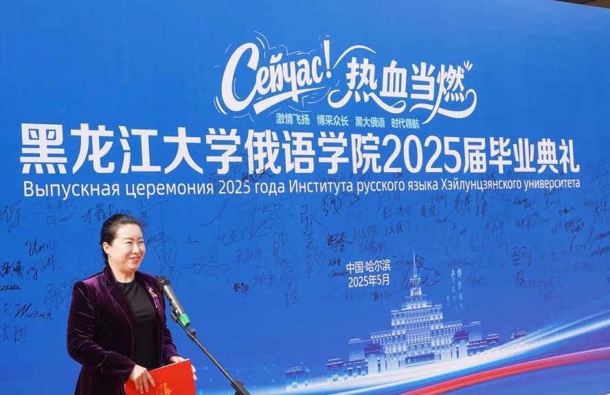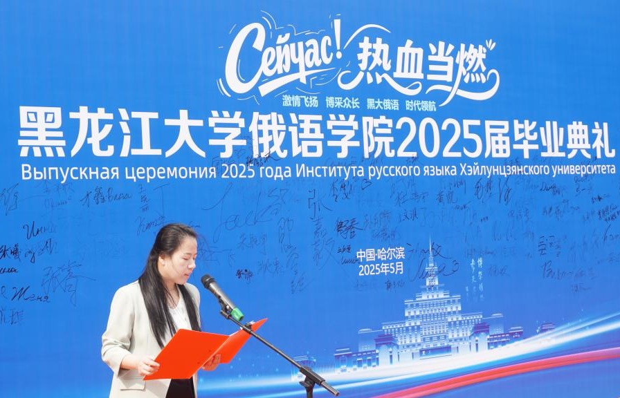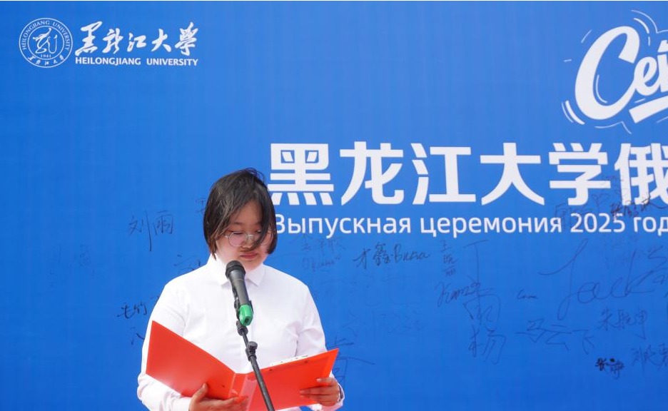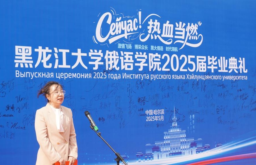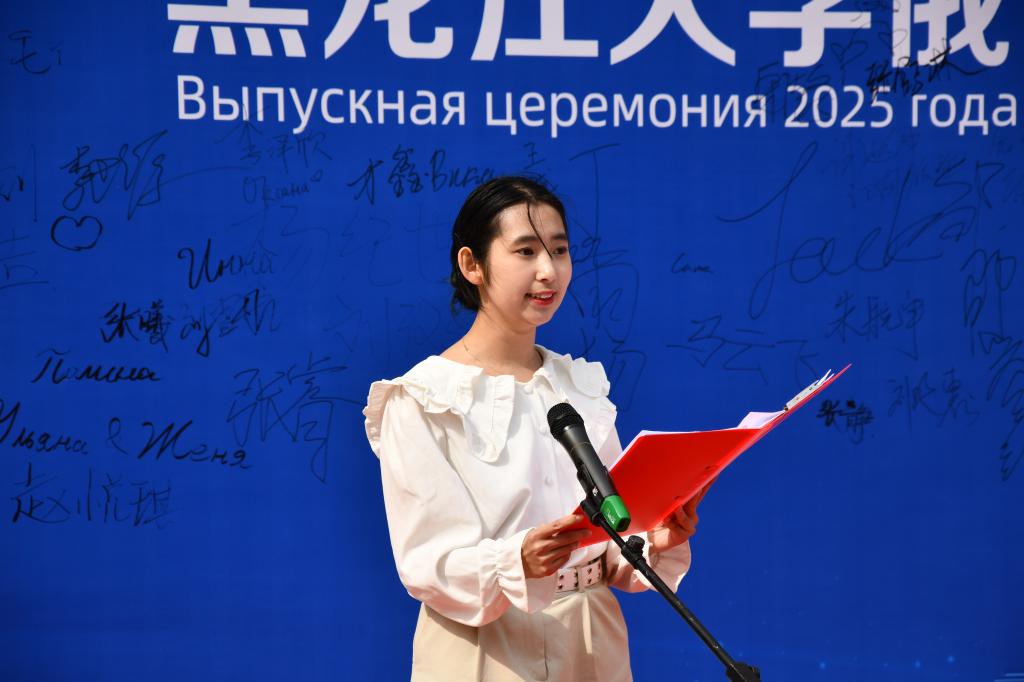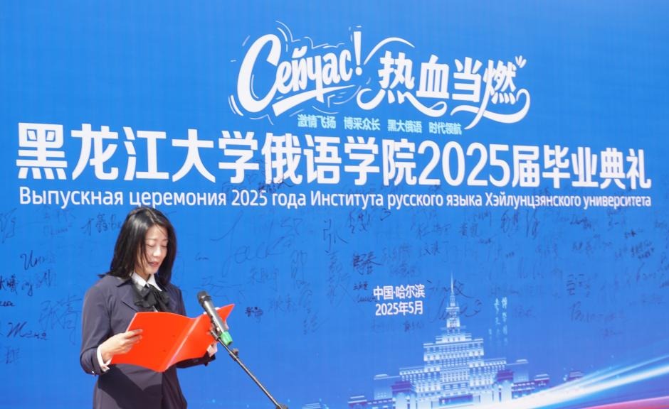 经理黄东晶教授致辞。她回望毕业生们的校园生活,祝贺他们顺利毕业,希望大家一是要将个人发展与国家需求相结合,共负中俄大国外交的使命;二是要拓展国际视野,服务国家战略;三是要在挑战中成长,在挫折中超越。希望毕业生以语言为舟,以文化为帆,在中俄交流的广阔海洋中破浪前行,牢记“博学慎思,参天尽物”的校训,以人文素养为根基,以终身学习为信念,在世界的舞台上绽放光芒。