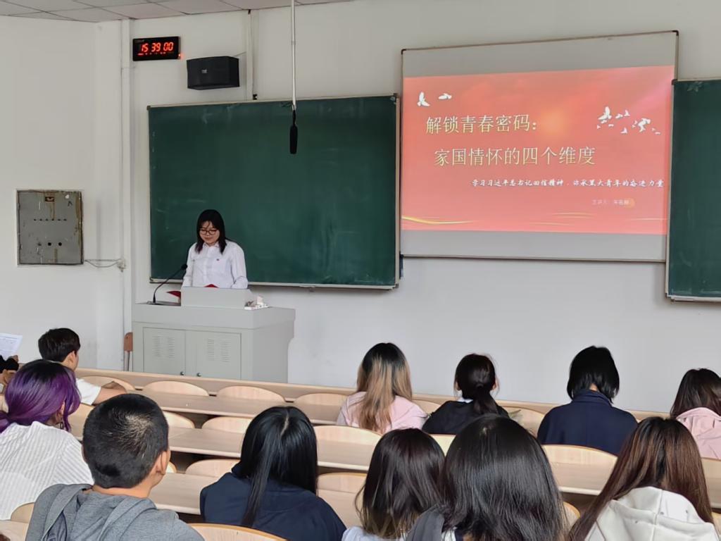 朱名赫同学以“解锁青春密码:家国情怀的四个维度”为题展开本次宣讲。她以“相机”为线,结合相关志愿经历,生动讲述了“我与相机”“小朋友与相机”的故事。她表示,同学们要积极结合自己的专业,充分发挥自身作用,在时代的洪流中站稳脚跟,为社会发展贡献青春力量。