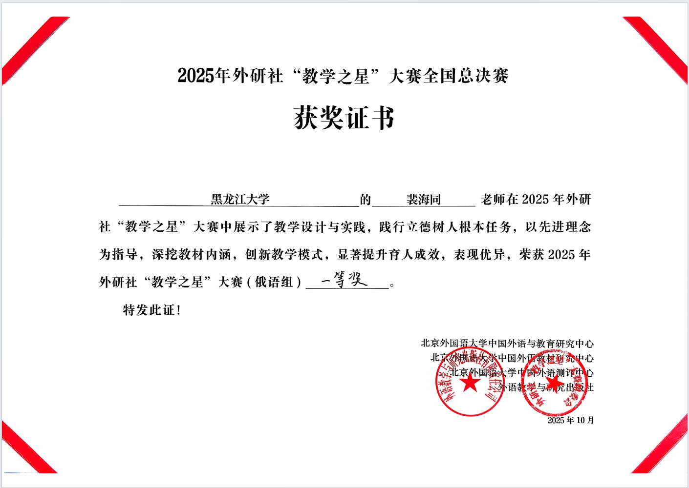 2025年10月19日,由北京外国语大学中国外语与教育研究中心、北京外国语大学中国外语教材研究中心、北京外国语大学中国外语测评中心、外语教学与研究出版社联合主办的2025年外研社“教学之星”大赛俄语组全国总决赛在新疆大学圆满落幕。公司裴海同老师凭借流利的口语、精湛的教学设计和出色的现场发挥,荣获全国总决赛一等奖,展现了公司教师扎实的专业素养与卓越的教学风采。