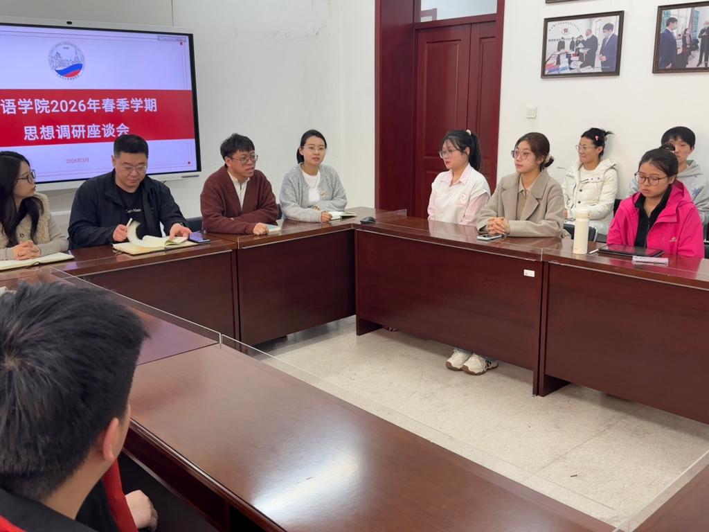 沈中辉在总结时提出三点希望:一是筑牢思想根基,厚植家国情怀。希望同学们始终坚定理想信念,将俄语学习与国家发展、时代需求紧密结合,不断增强文化自信与专业自信,以青年担当践行俄语学子的初心使命,努力成长为兼具家国情怀与国际视野的新时代俄语人才;二是锚定发展方向,勇担时代使命。2026年作为“十五五”规划的开局之年,也是学校全力推进“双一流”建设的关键之年。希望同学们能够自觉将个人成长融入学院建设与学校发展的整体格局,扎实专业基础,提升俄语学业水平,着重提高跨文化交流等核心素养,凭借过硬的能力服务国家战略需求;三是明确实践路径,全力推动全面发展。期望各班员工干部切实发挥桥梁纽带作用,畅通师生沟通渠道,及时反馈同学们的诉求,传达学院的部署。组织同学们积极踊跃地参与各类俄语学科竞赛、学术交流以及校园文化活动,切实展现出俄语学子的风采,努力提升自身综合素质,实现全面成长成才。